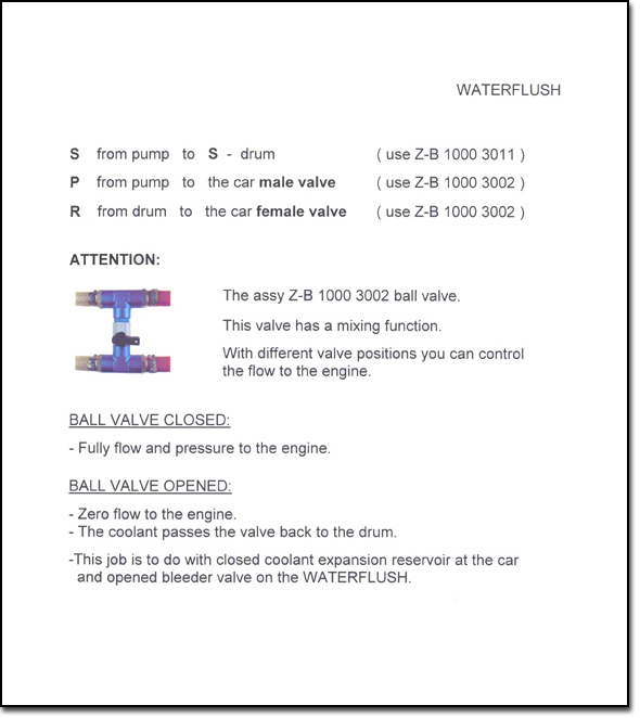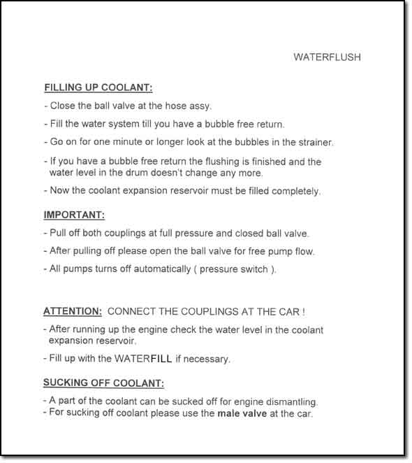 | Refill, Flush and Remove coolant | Waterflush unit with pump, 30L drum and hose assembley | |||